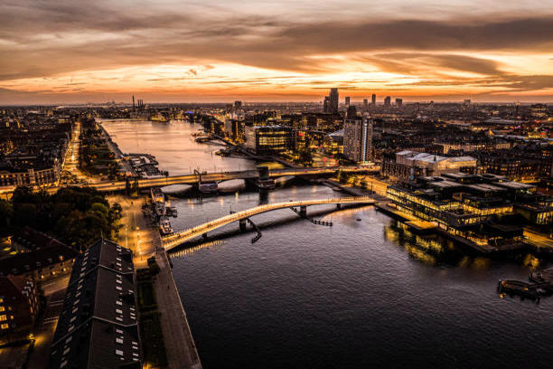 Drone photo of Copenhagen cityscape at sunset with illuminated buildings.