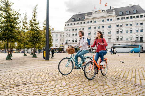 Young couple riding their bikes on the street in Copenhagen in Denmark.
