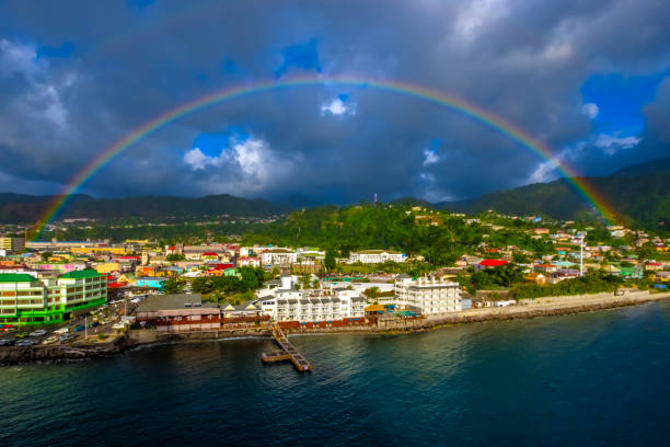 Beautiful rainbow and storm clouds over Roseau, Dominica.