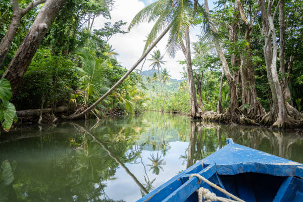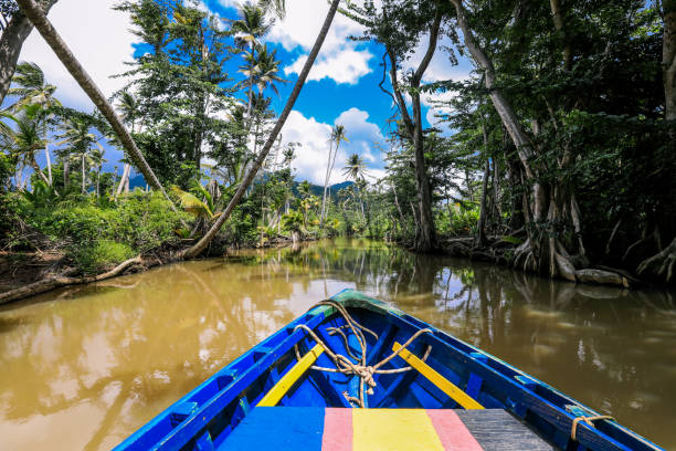 Explore the tranquil waters of Indian River in Dominica on a sunny day in a colorful boat