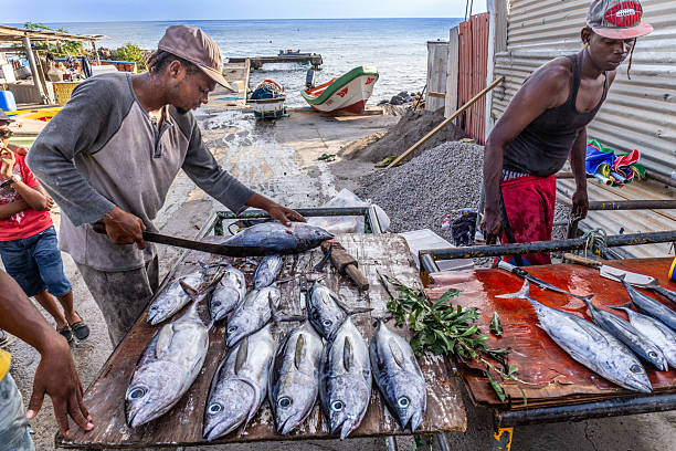 Fishermen preparing todays catch for direct selling to the people at the harbor, local fish market