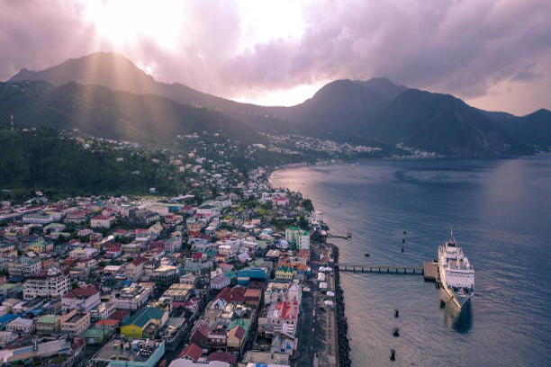 Stunning aerial view of Roseau in Dominica with hills and harbor at sunset