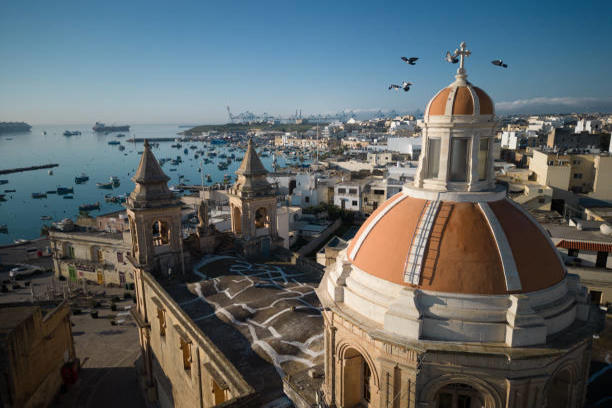 Aerial shot of Parish Church of Our Lady of Pompei, Marsaxlokk, Malta