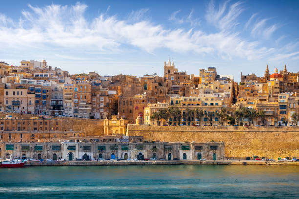 Aerial View of Senglea and Grand Harbour, Malta with Boats and Fortifications on a Sunny Day