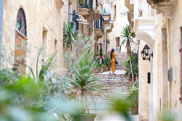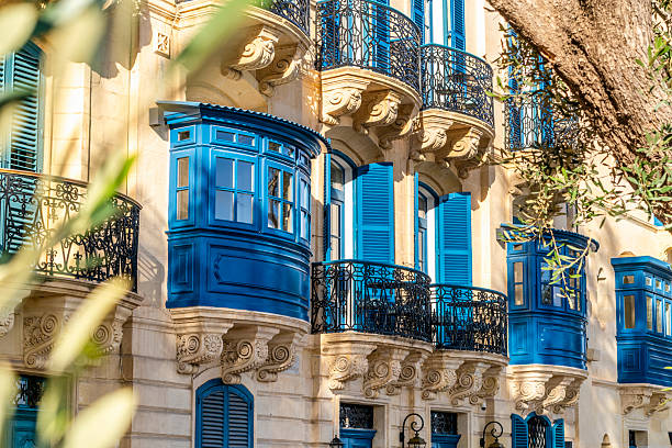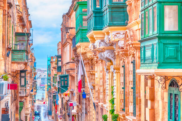 Traditional Maltese Street with Colorful Wooden Balconies and Limestone Houses in Valletta