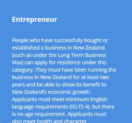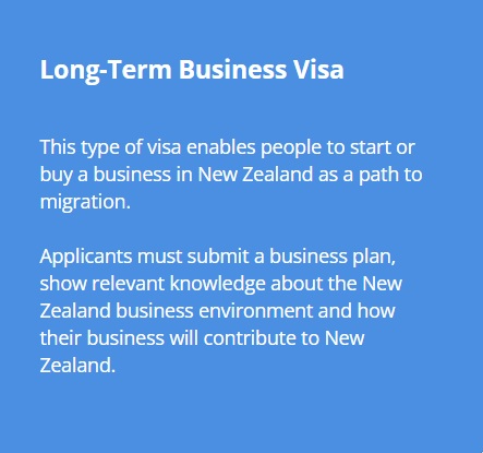 People who wish to start a business in New Zealand (self-employed) can apply for a Long-Term Business Visa initially, and then apply under the Entrepreneurship category for Residence.