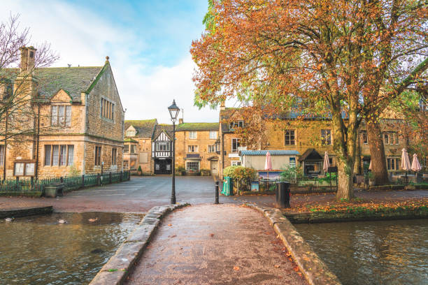 Vintage pedestrian bridge over the river Bourton-on-the-water, Cotswolds, UK